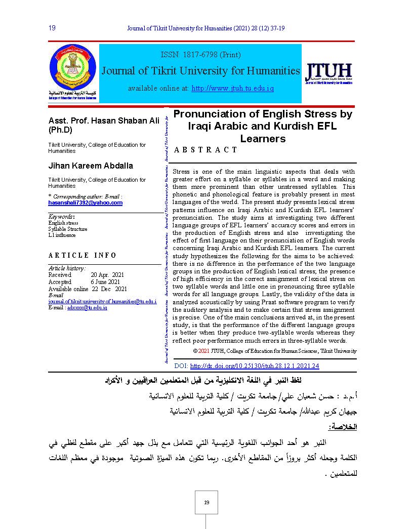 Stress is one of the main linguistic aspects that deals with greater effort on a syllable or syllables in a word and making them more prominent than other unstressed syllables. This phonetic and phonological feature is probably present in most languages of the world. The present study presents lexical stress patterns influence on Iraqi Arabic and Kurdish EFL learners’ pronunciation. The study aims at investigating two different language groups of EFL learners’ accuracy scores and errors in the production of English stress and also investigating the effect of first language on their pronunciation of English words concerning Iraqi Arabic and Kurdish EFL learners. The current study hypothesizes the following for the aims to be achieved: there is no difference in the performance of the two language groups in the production of English lexical stress; the presence of high efficiency in the correct assignment of lexical stress on two syllable words and little one in pronouncing three syllable words for all language groups. Lastly, the validity of the data is analyzed acoustically by using Praat software program to verify the auditory analysis and to make certain that stress assignment is precise. One of the main conclusions arrived at, in the present study, is that the performance of the different language groups is better when they produce two-syllable words whereas they reflect poor performance much errors in three-syllable words.