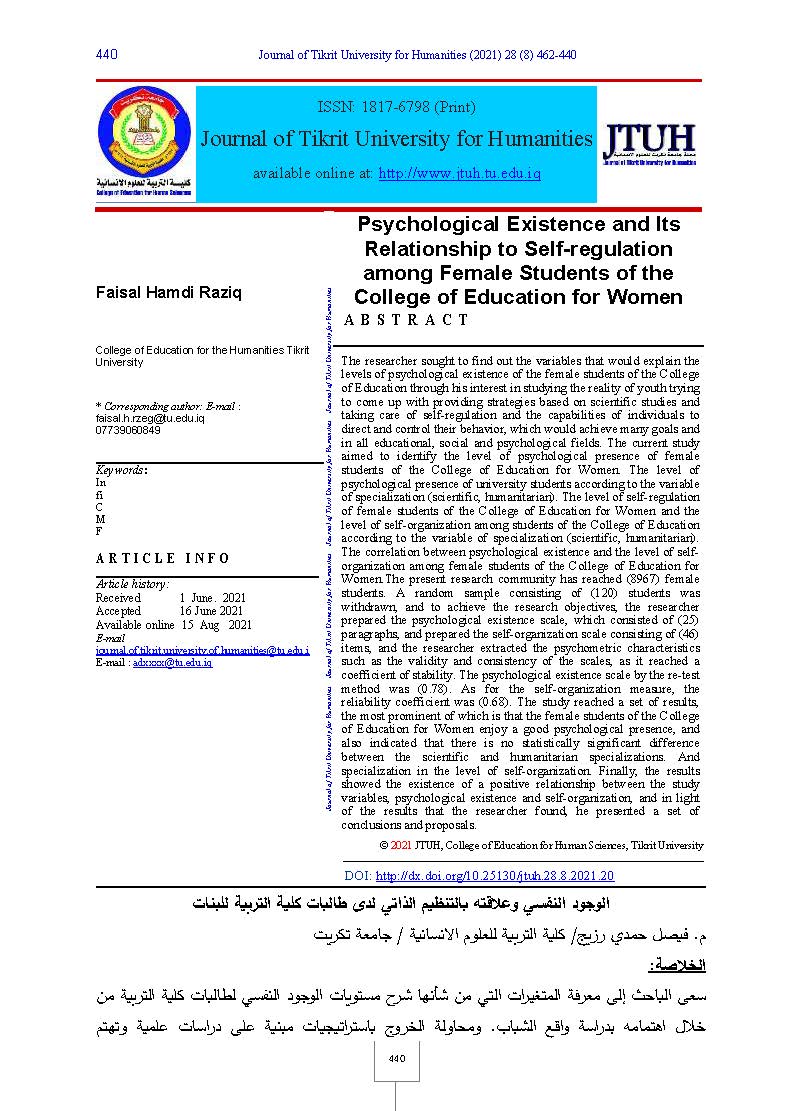 The researcher sought to find out the variables that would explain the levels of psychological existence of the female students of the College of Education through his interest in studying the reality of youth trying to come up with providing strategies based on scientific studies and taking care of self-regulation and the capabilities of individuals to direct and control their behavior, which would achieve many goals and in all educational, social and psychological fields. The current study aimed to identify the level of psychological presence of female students of the College of Education for Women. The level of psychological presence of university students according to the variable of specialization (scientific, humanitarian). The level of self-regulation of female students of the College of Education for Women and the level of self-organization among students of the College of Education according to the variable of specialization (scientific, humanitarian). The correlation between psychological existence and the level of self-organization among female students of the College of Education for Women.The present research community has reached (8967) female students. A random sample consisting of (120) students was withdrawn, and to achieve the research objectives, the researcher prepared the psychological existence scale, which consisted of (25) paragraphs, and prepared the self-organization scale consisting of (46) items, and the researcher extracted the psychometric characteristics such as the validity and consistency of the scales, as it reached a coefficient of stability. The psychological existence scale by the re-test method was (0.78). As for the self-organization measure, the reliability coefficient was (0.68). The study reached a set of results, the most prominent of which is that the female students of the College of Education for Women enjoy a good psychological presence, and also indicated that there is no statistically significant difference between the scientific and humanitarian specializations. And specialization in the level of self-organization. Finally, the results showed the existence of a positive relationship between the study variables, psychological existence and self-organization, and in light of the results that the researcher found, he presented a set of conclusions and proposals.