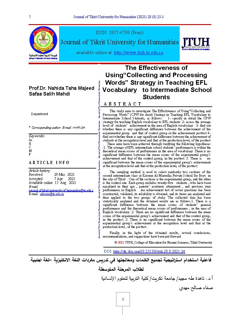 This study aims to investigate The Effectiveness of Using“Collecting and Processing Words” (CPW for short) Strategy in Teaching EFL Vocabulary to Intermediate School Students, as follows: 1- specify in detail the CPW strategy for teaching English vocabulary to EFL students .2- assess the average level of students’ achievement in the area of English vocabulary .3- find out whether there is any significant difference between the achievement of the experimental group and that of control group in the achievement posttest 4- find out whether there is any significant difference between the achievement of students at the recognition level and that at the production level, of the posttest . These aims have been achieved through verifying the following hypotheses :1. The average of EFL intermediate school students’ performance is within the theoretical mean scores of performance in the area of vocabulary .There is no significant difference between the mean scores of the experimental group’s achievement and that of the control group, in the posttest. 3. There is no significant between the mean scores of the experimental group’s achievement at the recognition level and that at the production level, of the posttest.