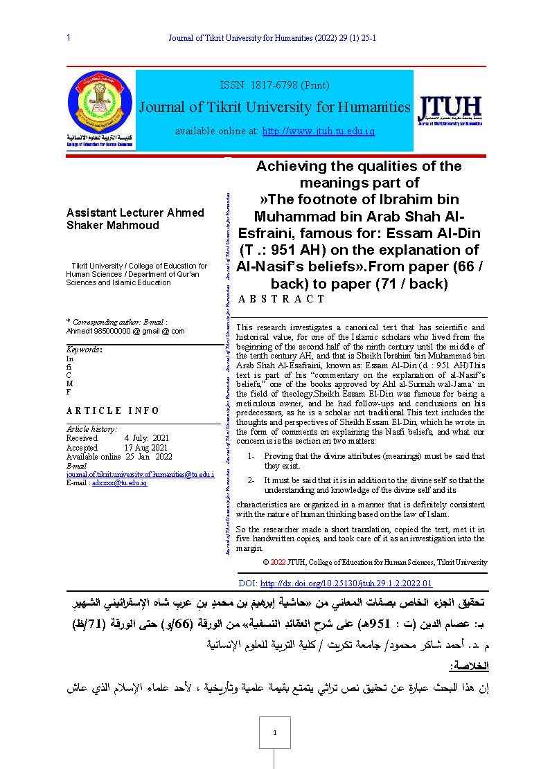 Achieving the qualities of the meanings part of «The footnote of Ibrahim bin Muhammad bin Arab Shah Al-Esfraini, famous for: Essam Al-Din (T .: 951 AH) on the explanation of Al-Nasif’s beliefs».From paper (66 / back) to paper (71 / back)