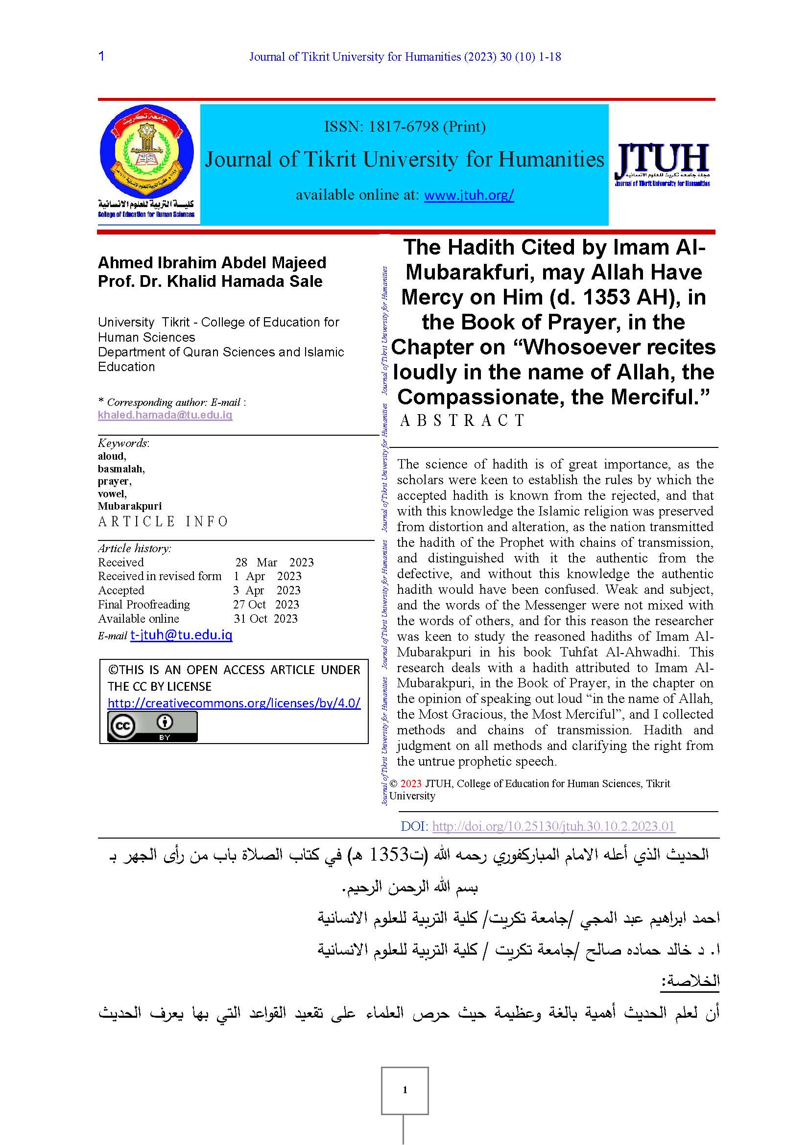 Abdel Majeed, A. I., & Saleh, K. H. (2023). The Hadith Cited by Imam Al-Mubarakfuri, may Allah Have Mercy on Him (d. 1353 AH), in the Book of Prayer, in the Chapter on “Whosoever recites loudly in the name of Allah, the Compassionate, the Merciful.”. Journal of Tikrit University for Humanities, 30(10, 2), 1–18. https://doi.org/10.25130/jtuh.30.10.2.2023.01