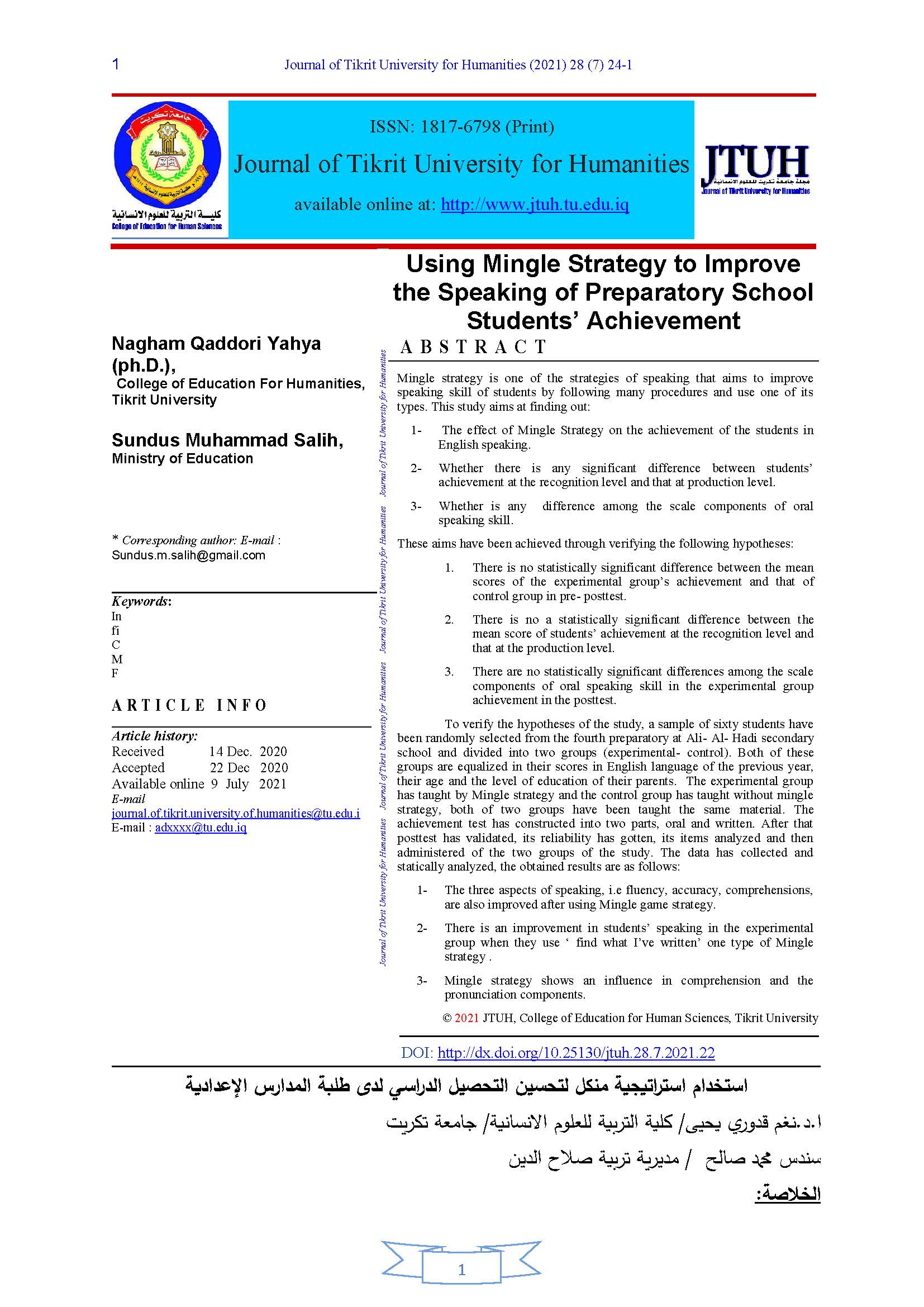 Yahya, N. Q., & Salih, S. M. (2021). Using Mingle Strategy to Improve the Speaking of Preparatory School Students’ Achievement. Journal of Tikrit University for Humanities, 28(7), 1–24. https://doi.org/10.25130/jtuh.28.7.2021.22