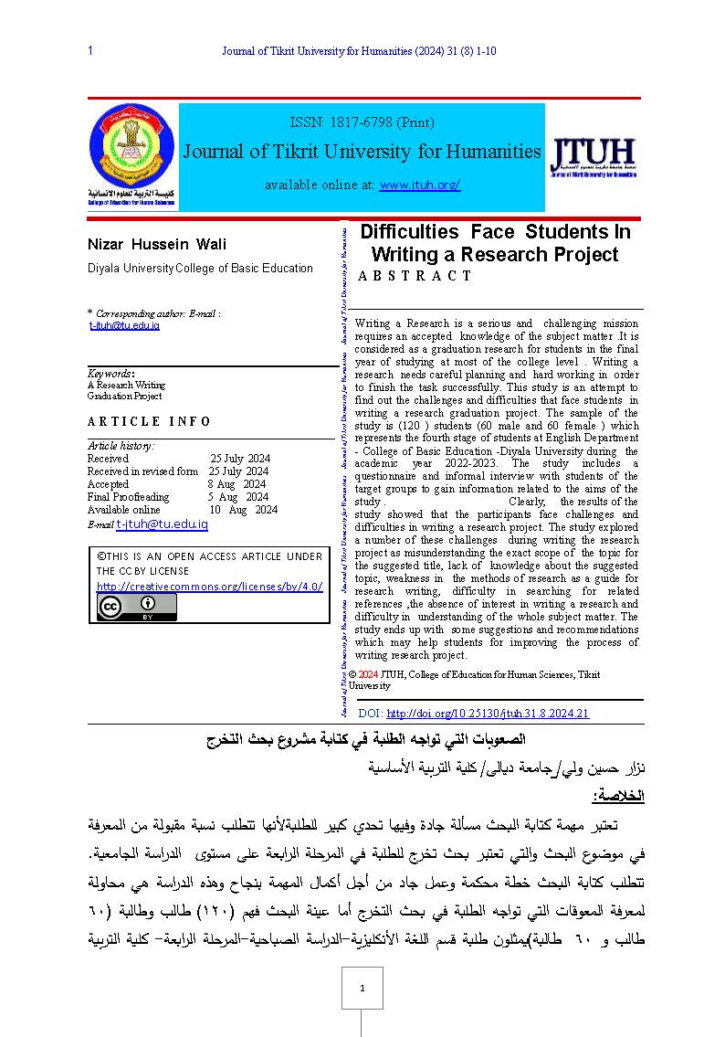 Writing a Research is a serious and challenging mission requires an accepted knowledge of the subject matter .It is considered as a graduation research for students in the final year of studying at most of the college level . Writing a research needs careful planning and hard working in order to finish the task successfully. This study is an attempt to find out the challenges and difficulties that face students in writing a research graduation project. The sample of the study is (120 ) students (60 male and 60 female ) which represents the fourth stage of students at English Department - College of Basic Education -Diyala University during the academic year 2022-2023. The study includes a questionnaire and informal interview with students of the target groups to gain information related to the aims of the study . Clearly, the results of the study showed that the participants face challenges and difficulties in writing a research project. The study explored a number of these challenges during writing the research project as misunderstanding the exact scope of the topic for the suggested title, lack of knowledge about the suggested topic, weakness in the methods of research as a guide for research writing, difficulty in searching for related references ,the absence of interest in writing a research and difficulty in understanding of the whole subject matter. The study ends up with some suggestions and recommendations which may help students for improving the process of writing research project.