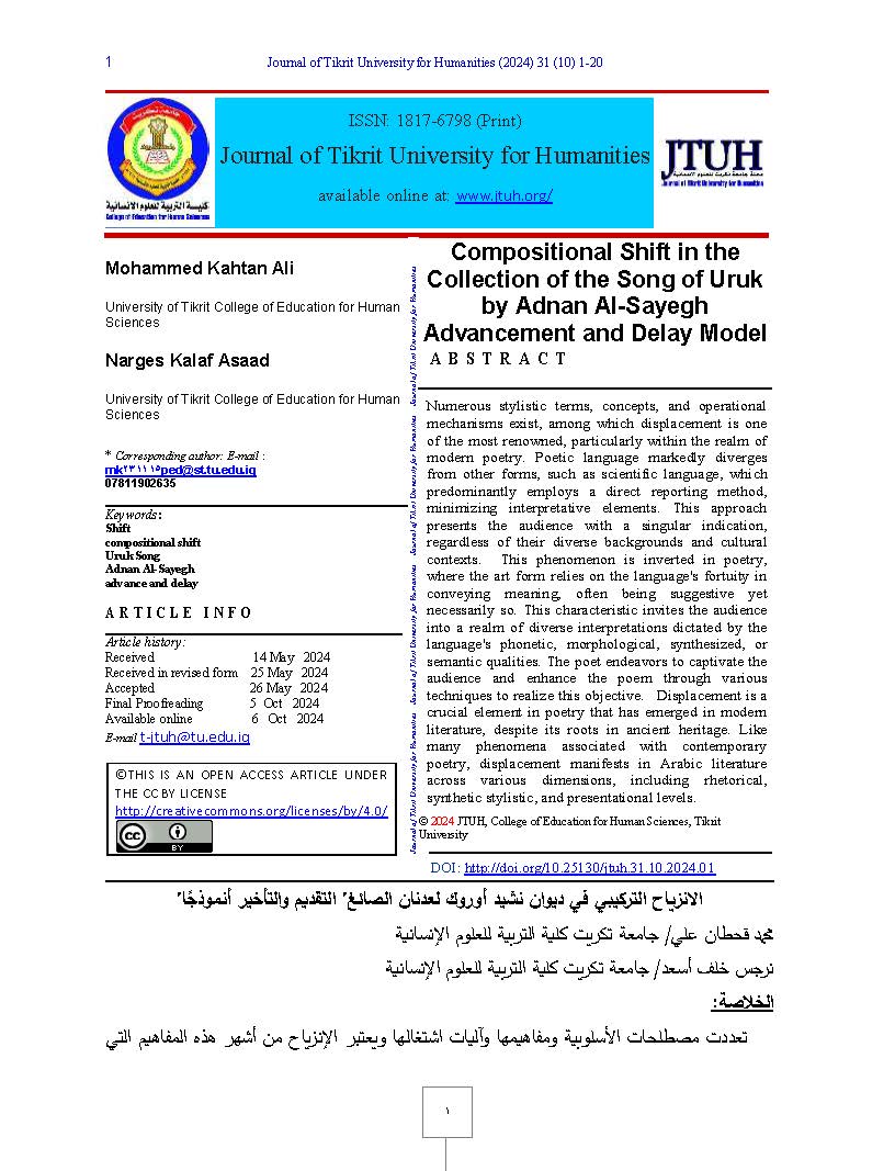 Compositional Shift in the Collection of the Song of Uruk by Adnan Al-Sayegh Advancement and Delay Model