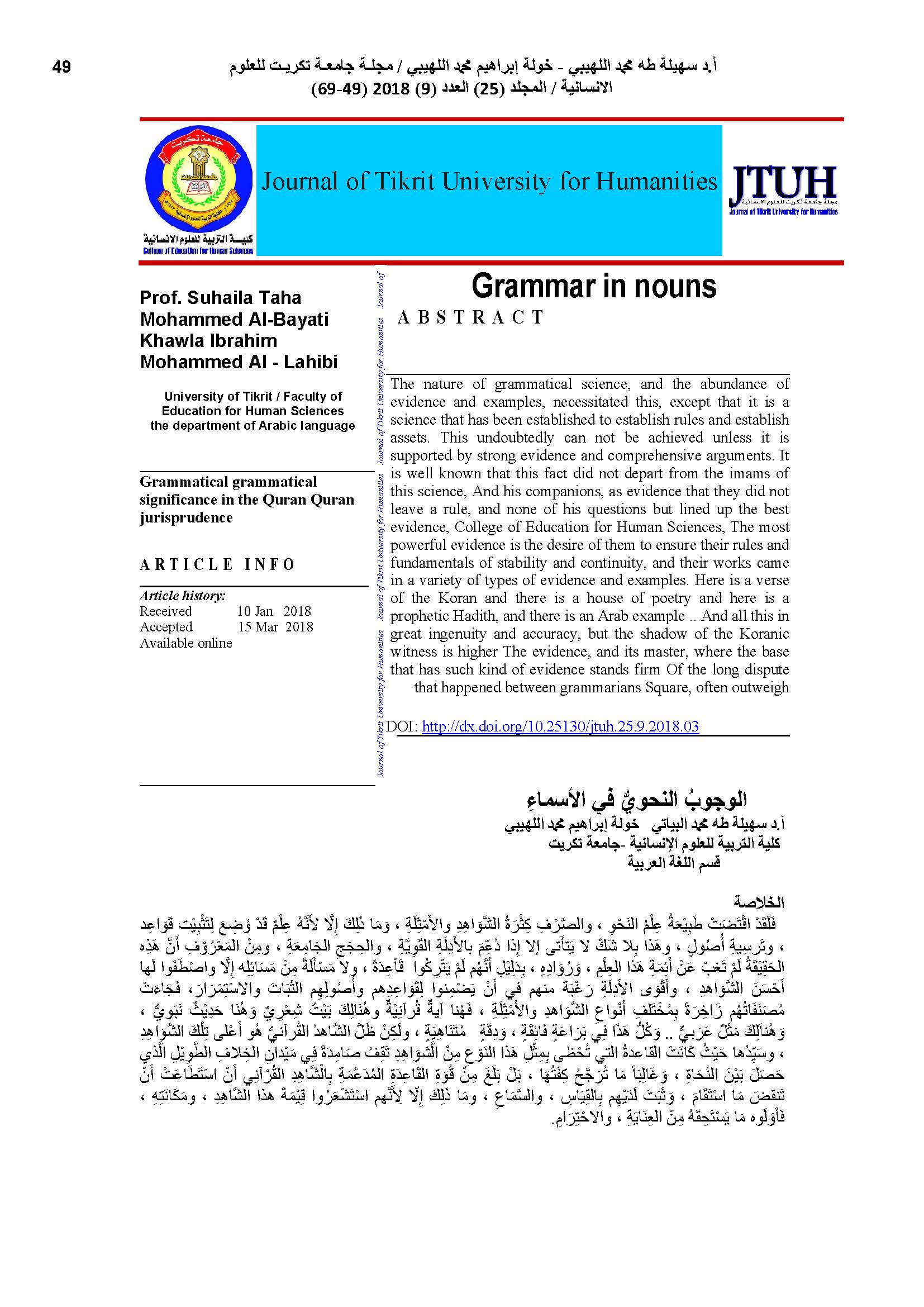 The nature of grammatical science, and the abundance of evidence and examples, necessitated this, except that it is a science that has been established to establish rules and establish assets. This undoubtedly can not be achieved unless it is supported by strong evidence and comprehensive arguments. It is well known that this fact did not depart from the imams of this science, And his companions, as evidence that they did not leave a rule, and none of his questions but lined up the best evidence, College of Education for Human Sciences, The most powerful evidence is the desire of them to ensure their rules and fundamentals of stability and continuity, and their works came in a variety of types of evidence and examples. Here is a verse of the Koran and there is a house of poetry and here is a prophetic Hadith, and there is an Arab example .. And all this in great ingenuity and accuracy, but the shadow of the Koranic witness is higher The evidence, and its master, where the base that has such kind of evidence stands firm Of the long dispute that happened between grammarians Square, often outweigh