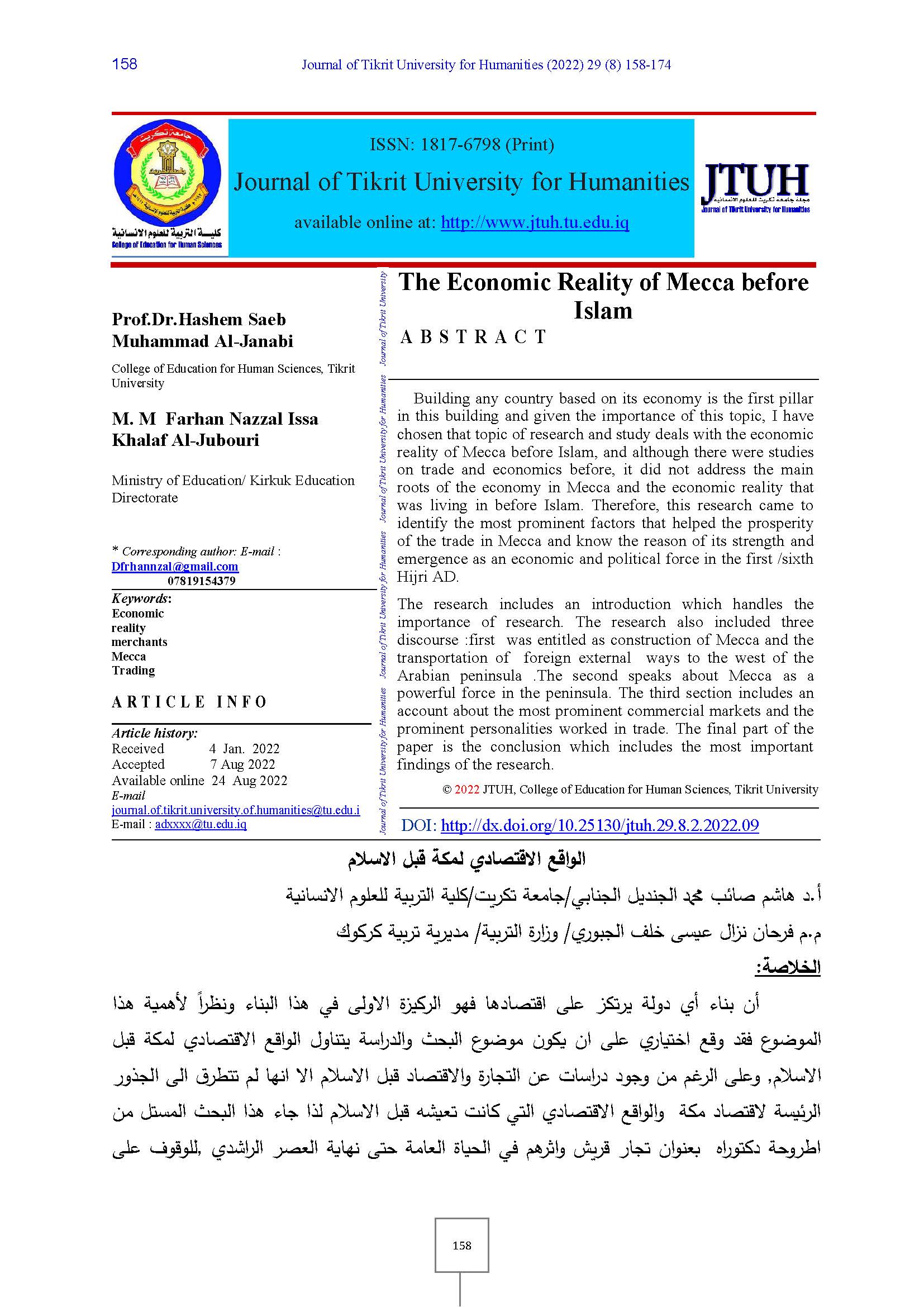 *-Al-Jubouri, Uday Salem Abdullah, and ,Vian Fakhr Al- Din Hamid,Crfts and Professions in Mecca before Islam through the Narratives of Ibn Al-Kalbi (T:204AH-819AD),research in the Journal of Tikrit University for Human Scienes , Volume 29,Issue 3,part2,(Tikrit,2022AD).