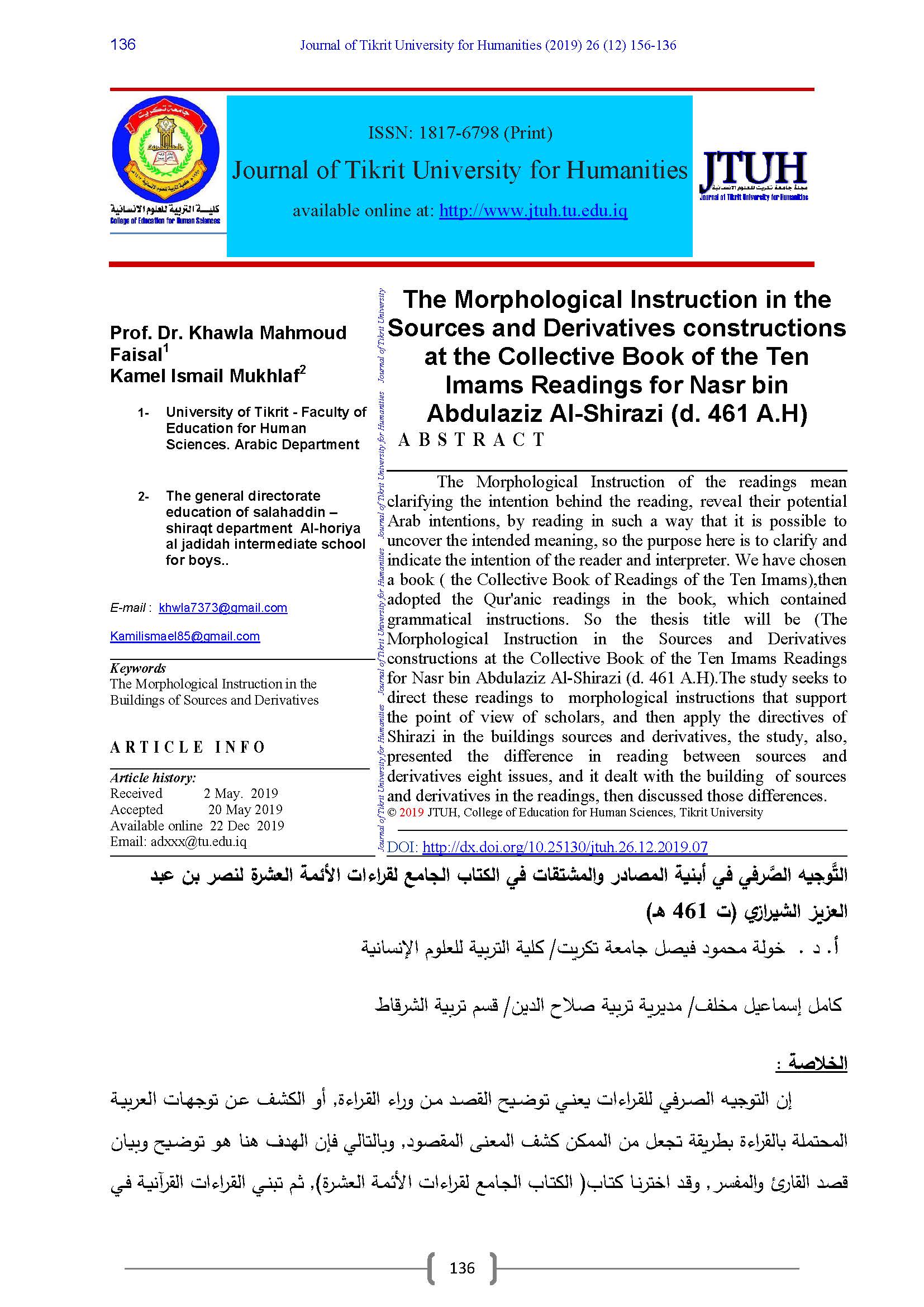 The Morphological Instruction of the readings mean clarifying the intention behind the reading, reveal their potential Arab intentions, by reading in such a way that it is possible to uncover the intended meaning, so the purpose here is to clarify and indicate the intention of the reader and interpreter. We have chosen a book ( the Collective Book of Readings of the Ten Imams),then adopted the Qur'anic readings in the book, which contained grammatical instructions. So the thesis title will be (The Morphological Instruction in the Sources and Derivatives constructions at the Collective Book of the Ten Imams Readings for Nasr bin Abdulaziz Al-Shirazi (d. 461 A.H).The study seeks to direct these readings to morphological instructions that support the point of view of scholars, and then apply the directives of Shirazi in the buildings sources and derivatives, the study, also, presented the difference in reading between sources and derivatives eight issues, and it dealt with the building of sources and derivatives in the readings, then discussed those differences.