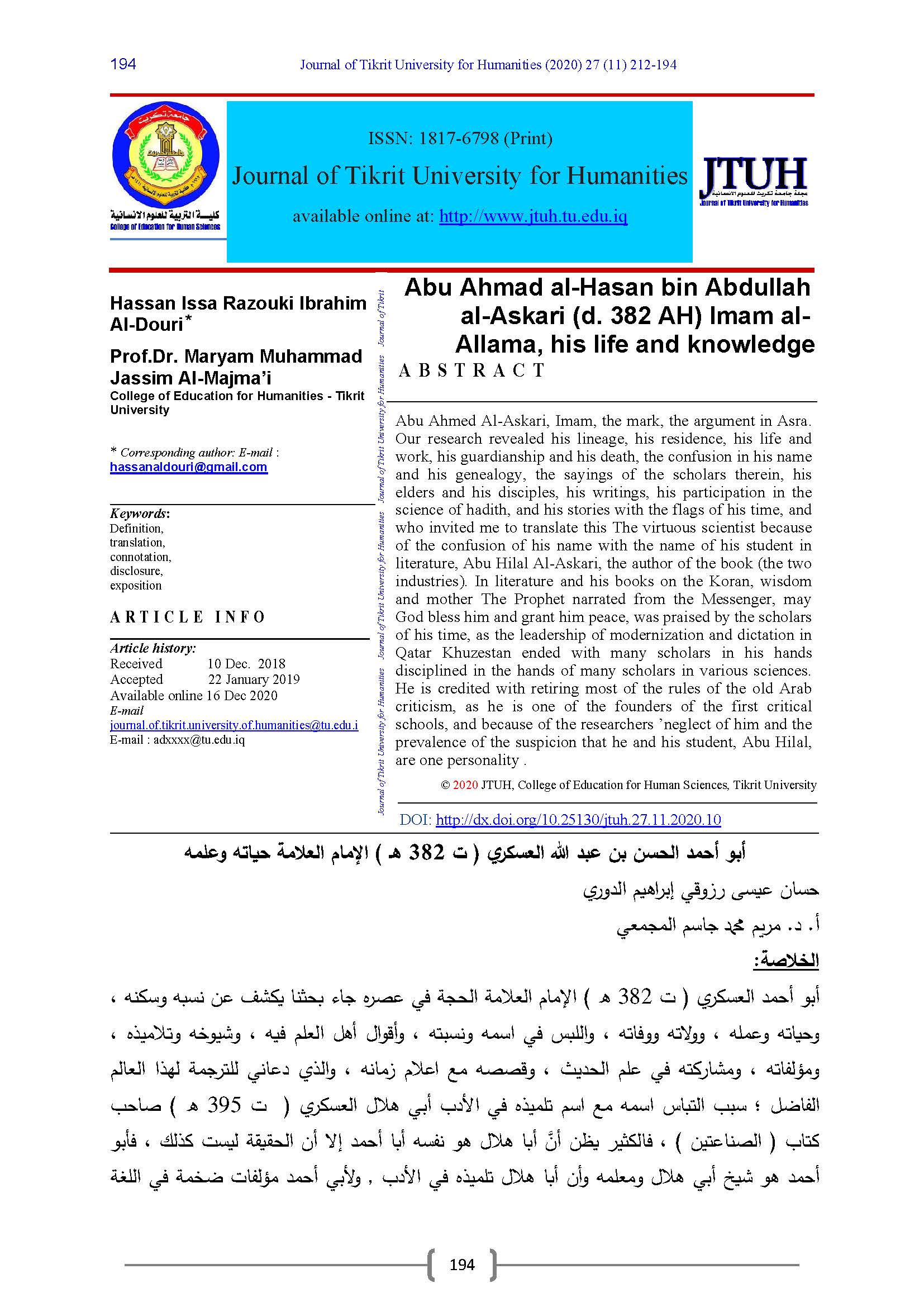 Abu Ahmad al-Hasan bin Abdullah al-Askari (d. 382 AH) Imam al-Allama, his life and knowledge