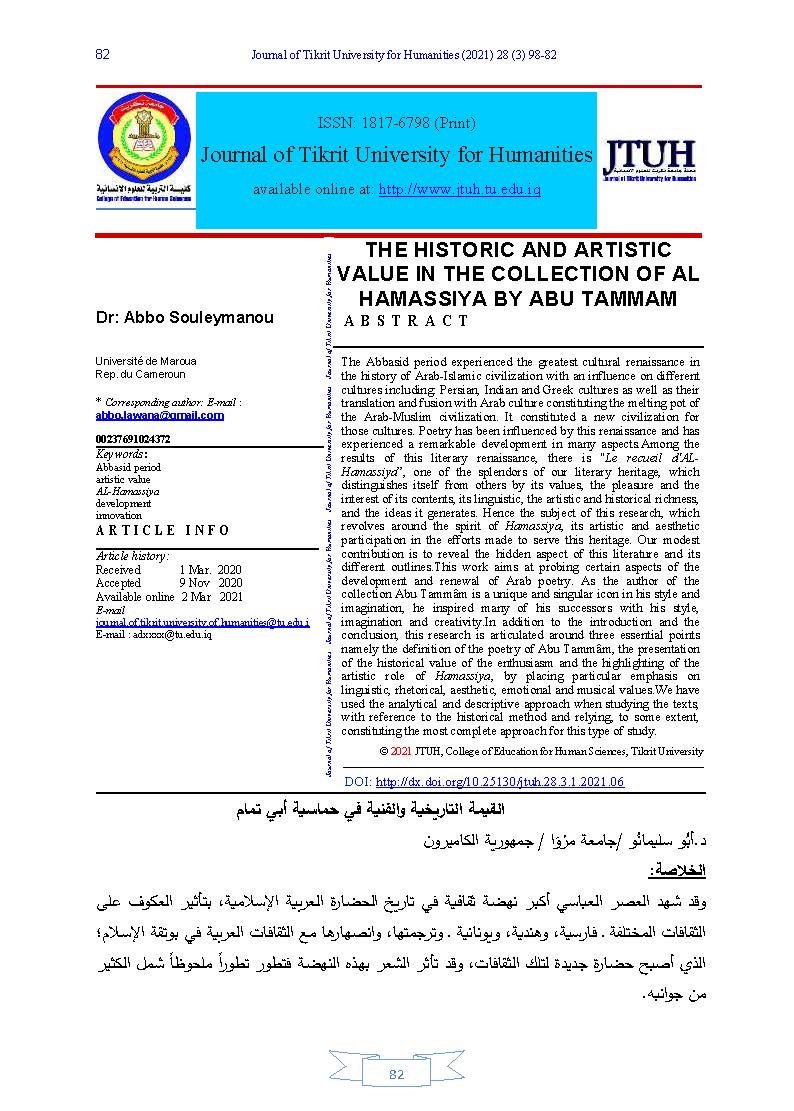 Souleymanou, A. (2021). THE HISTORIC AND ARTISTIC VALUE IN THE COLLECTION OF AL HAMASSIYA BY ABU TAMMAM. Journal of Tikrit University for Humanities, 28(3, 1), 82–98. https://doi.org/10.25130/jtuh.28.3.1.2021.06