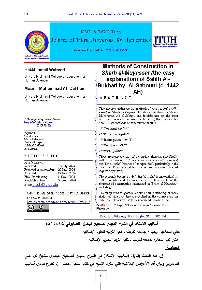 This research addresses the 'methods of construction' (أساليب الإنشاء) in 'Sharh al-Muyassar li Sahih al-Bukhari' by Sheikh Muhammad Ali al-Sabuni, and it elaborates on the most important rhetorical purposes mentioned by the Sheikh in his book. These methods of construction include: